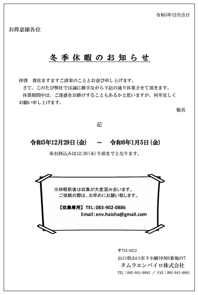 【冬期休暇のお知らせ】