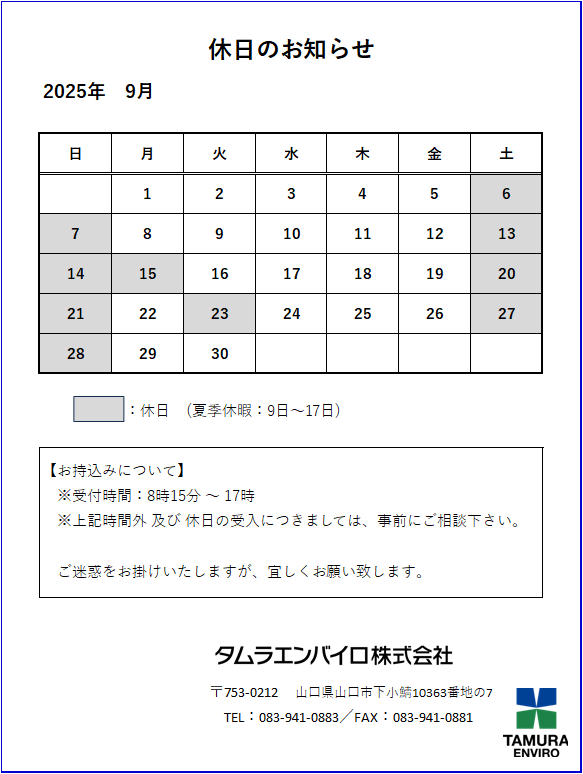 【2025年9月 休日のお知らせ】