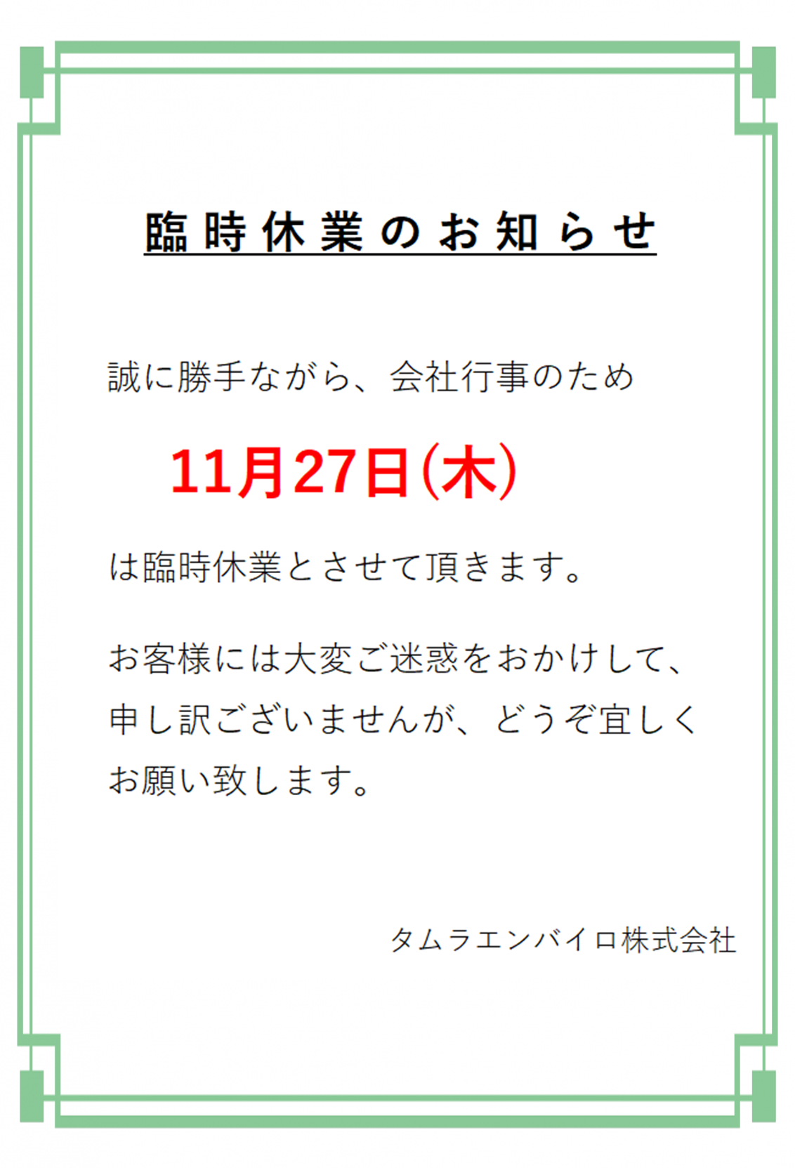 11月27日(木)は、会社行事のため、終日お休みとなります。