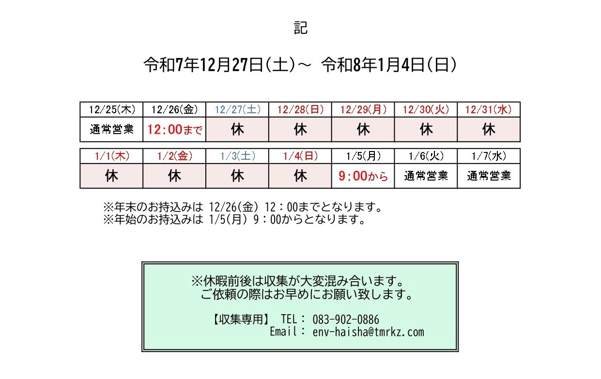 年内は12月26日の午前中まで、年始は1月5日の9時からとなっております。